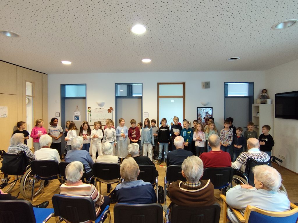 Mit dem Gedicht „November“ von Heinrich Seidel eröffneten die Kinder ihren Auftritt. Anschließend trugen sie im Kanon „Hejo, spann den Wagen an“ und danach „Der Herbst ist da“ vor und ein paar Seniorinnen und Senioren stimmten bei den beiden traditionellen Stücken mit ein.