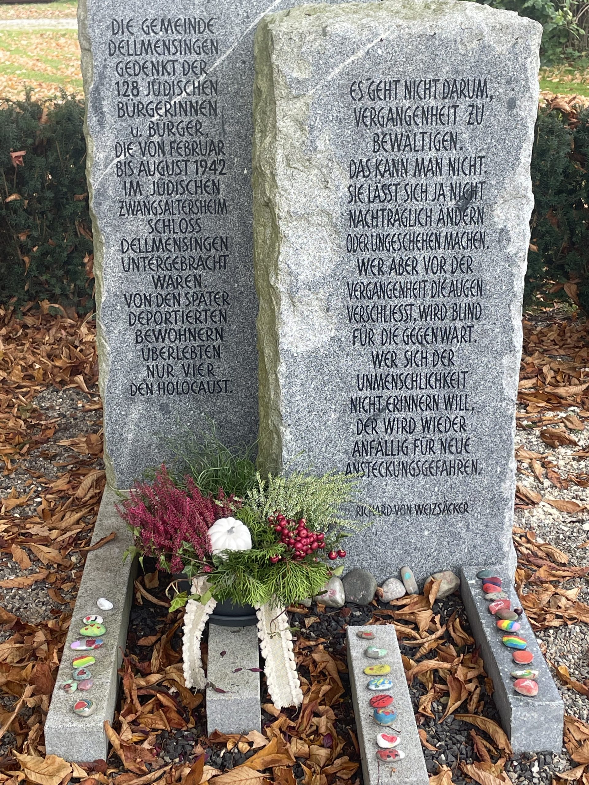 Am Montag, den 20.10.25, besuchte die Klasse 4 der Joseph-von-Egle-Grundschule die Gedenkstätte Schloss Dellmensingen. Zum Gedenken an die 128 jüdischen Bürgerinnen und Bürger, die von Februar bis August 1942 im jüdischen Zwangsaltersheim Schloss Dellmensingen untergebracht waren, schmückten die Schülerinnen und Schüler das Denkmal mit einer Schale Herbstblumen. Die im Kunstunterricht bemalten Steine mit Friedenssymbolen wurden sorgfältig von den Kindern platziert
