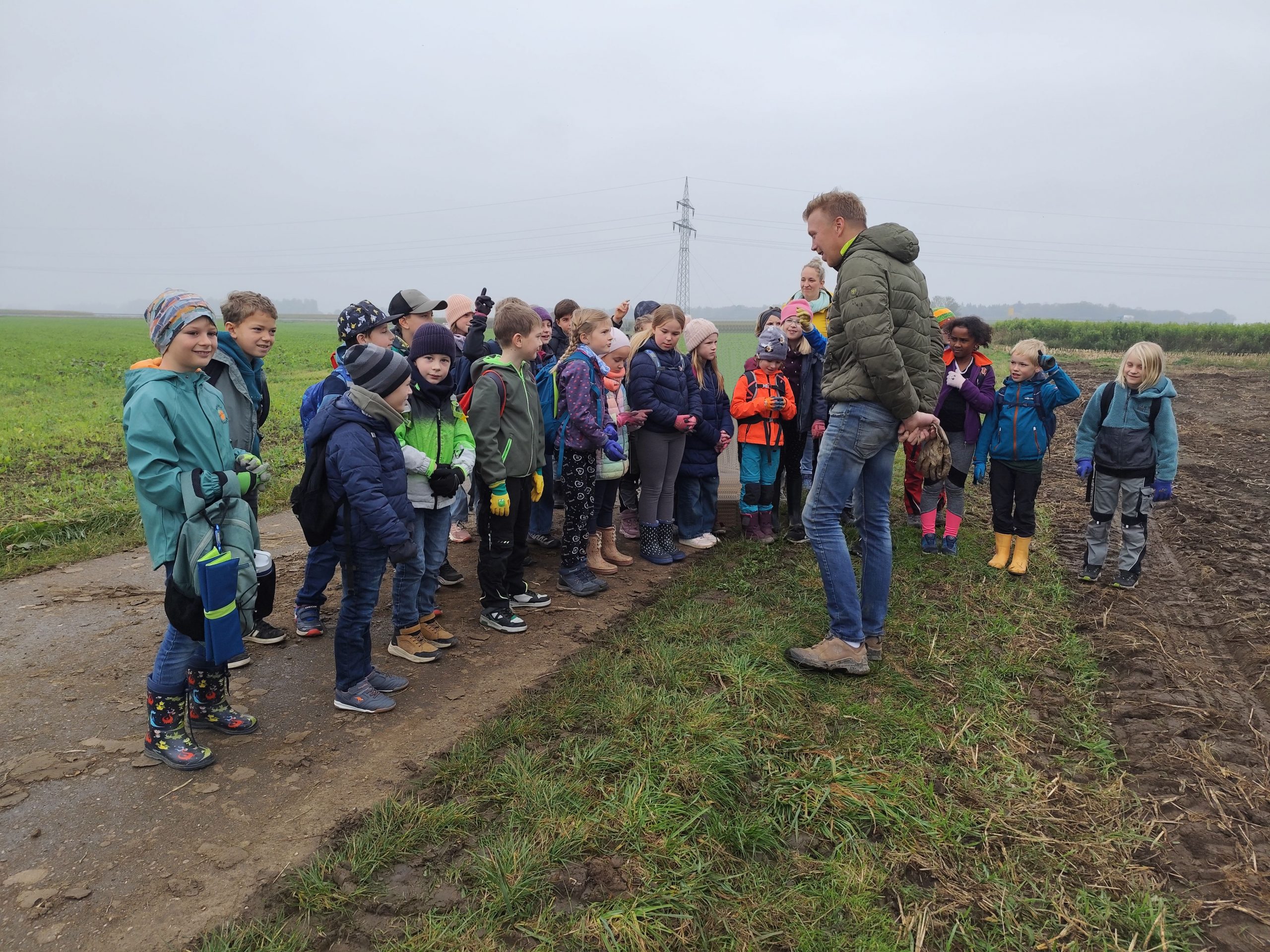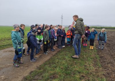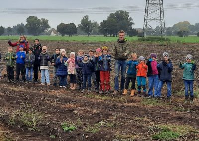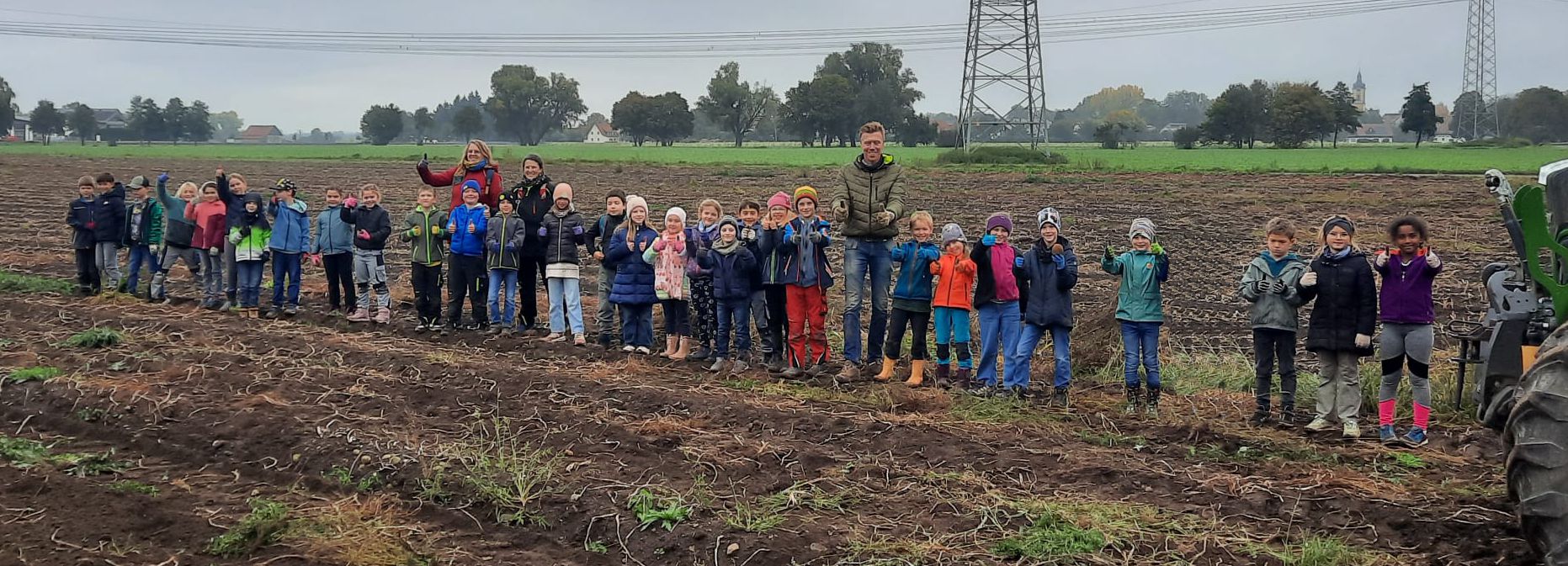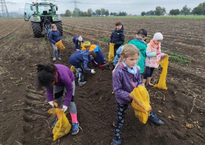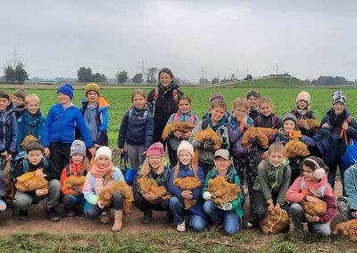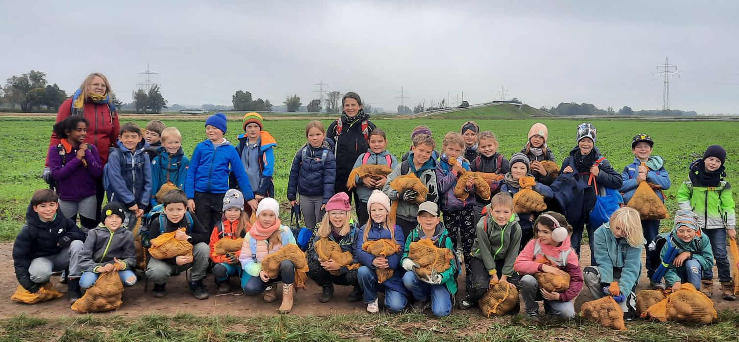 Am 9. Oktober machten sich die Klassen 3a und 3b gemeinsam auf zum Kartoffelacker der Familie Häußler. Dort wurden sie von der ganzen Familie begrüßt. Zuerst durften die Kinder alles berichten, was sie schon über die Kartoffel wussten und erfuhren danach von Herrn Häußler noch viel mehr. Anschließend durften alle Kinder in Kleingruppen mit der großen Erntemaschine mitfahren und sortierten ganz fleißig Steine, faulige Kartoffeln und andere Dinge aus, die nicht in eine gute Ernte gehören. Frau Häußler hatte zur Stärkung für alle einen äußerst leckeren Kartoffelsnack mitgebracht an welchem sich die Kinder und auch die Lehrkräfte stärken durften. Zum Abschluss konnten die Kinder noch sehen wie früher Kartoffel mit einem alten Kartoffelroder geerntet wurden. Dann durften die Kartoffeln gesammelt werden. Überglücklich und voll beladen traten alle den Weg zurück in die Schule an.