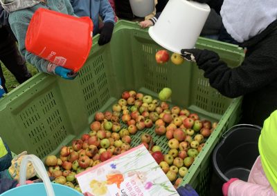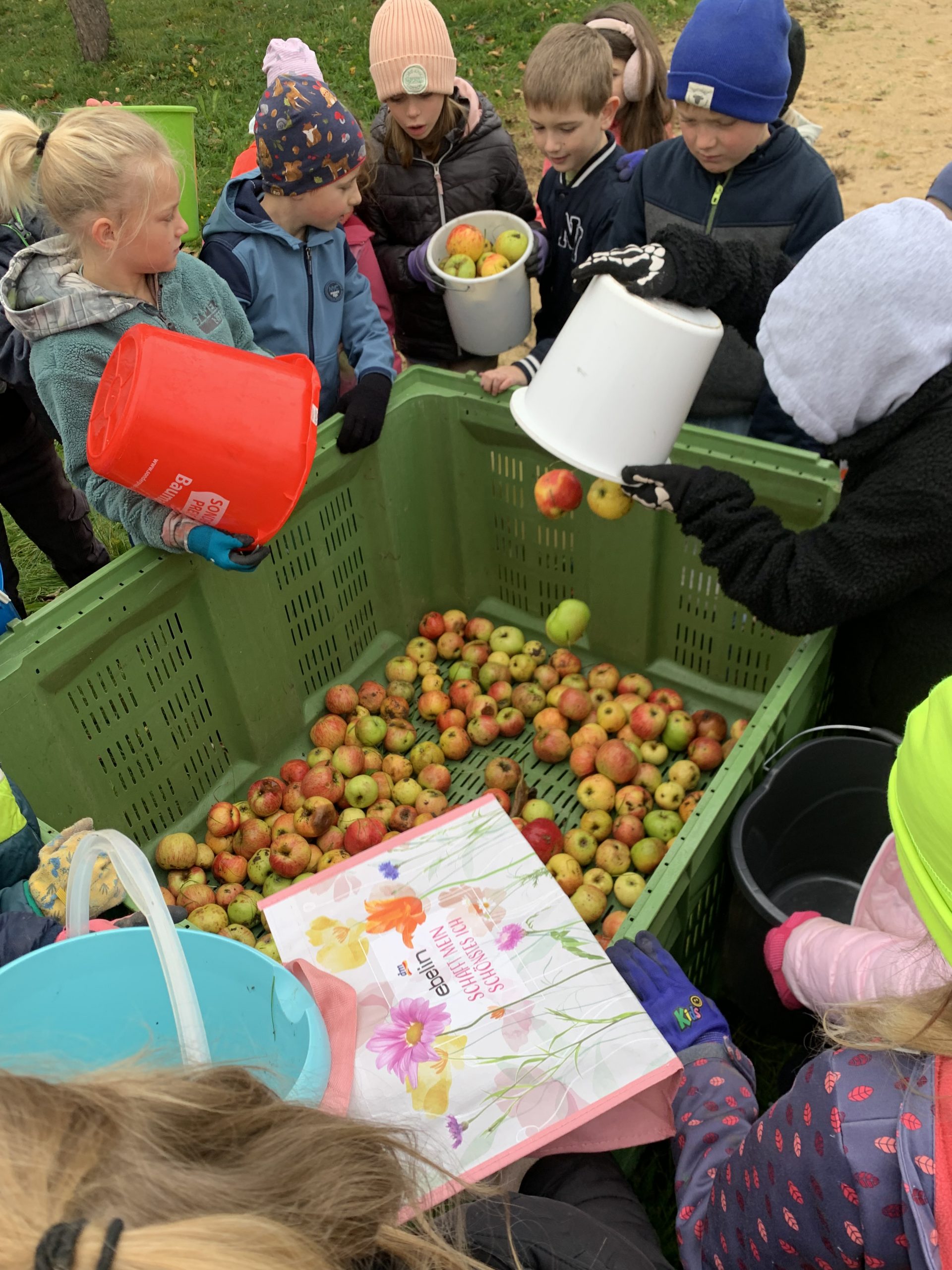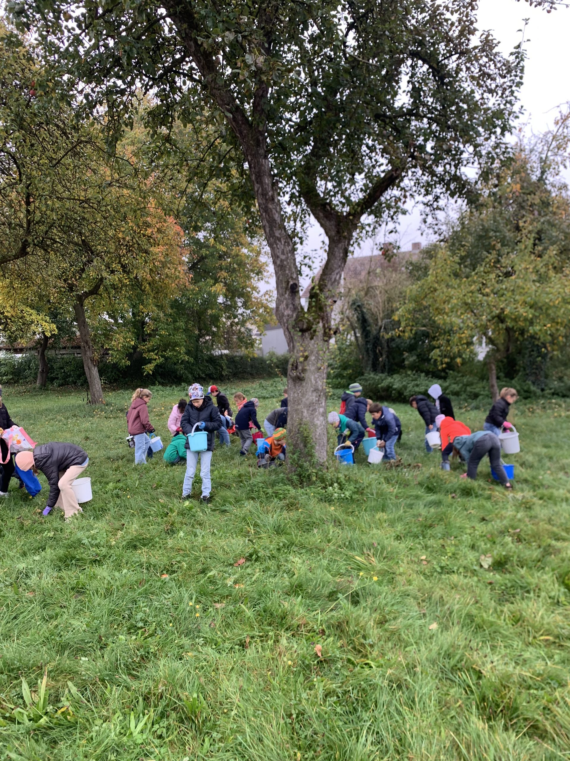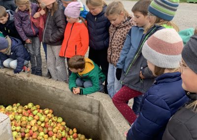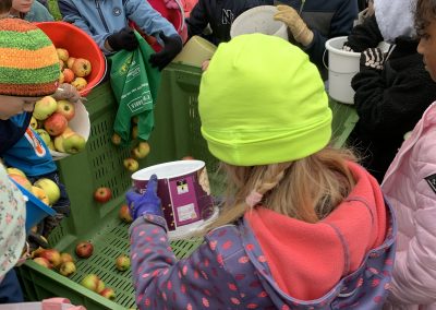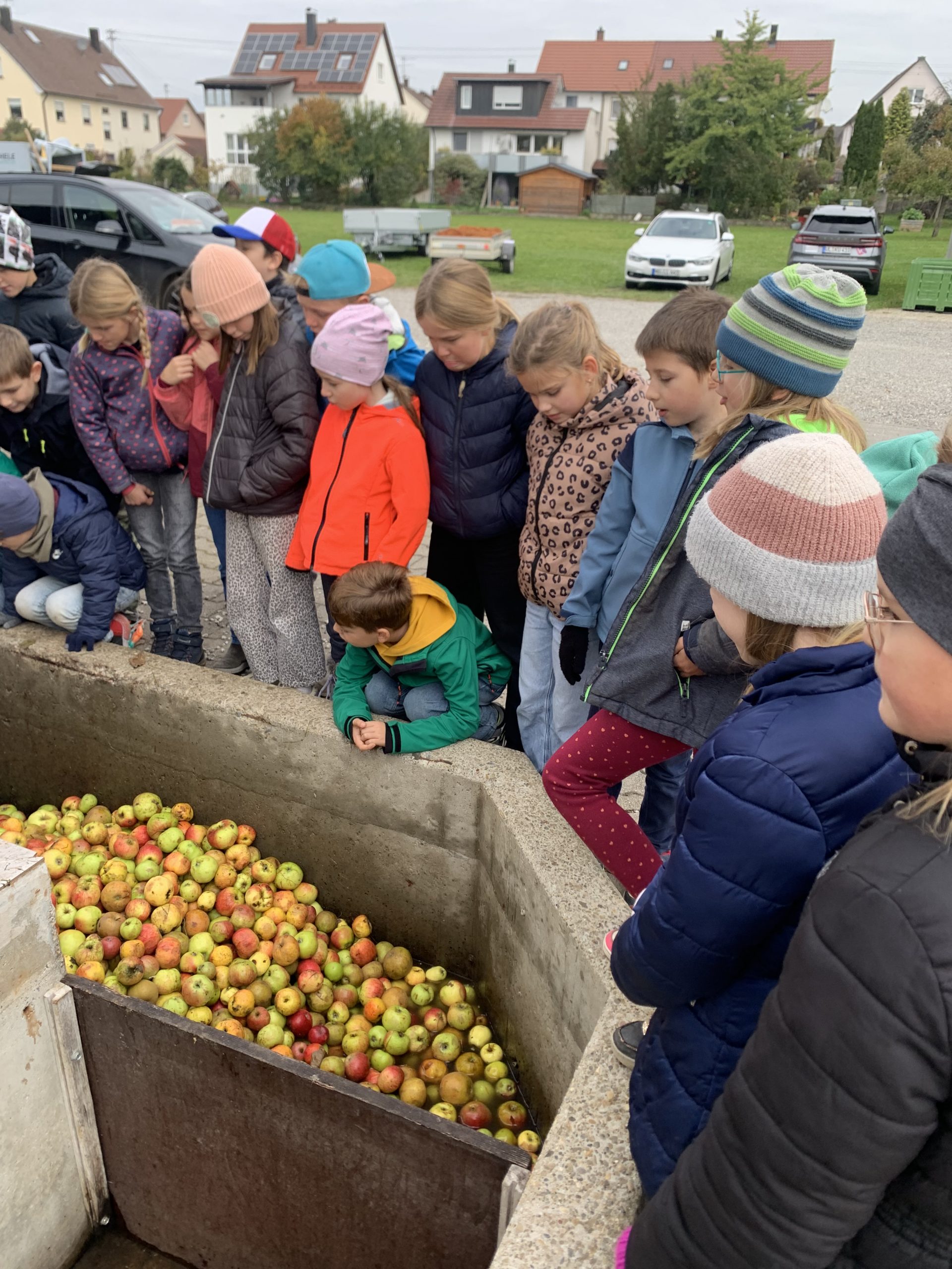 Zum 2. Naturtag der Jahrgangsstufe 3 ging es zur Mosterei Buchele. Dafür wurden hochmotiviert Äpfel auf der Wiese hinter der Schule gesammelt und gepflückt, bis die Eimer gefüllt waren.
