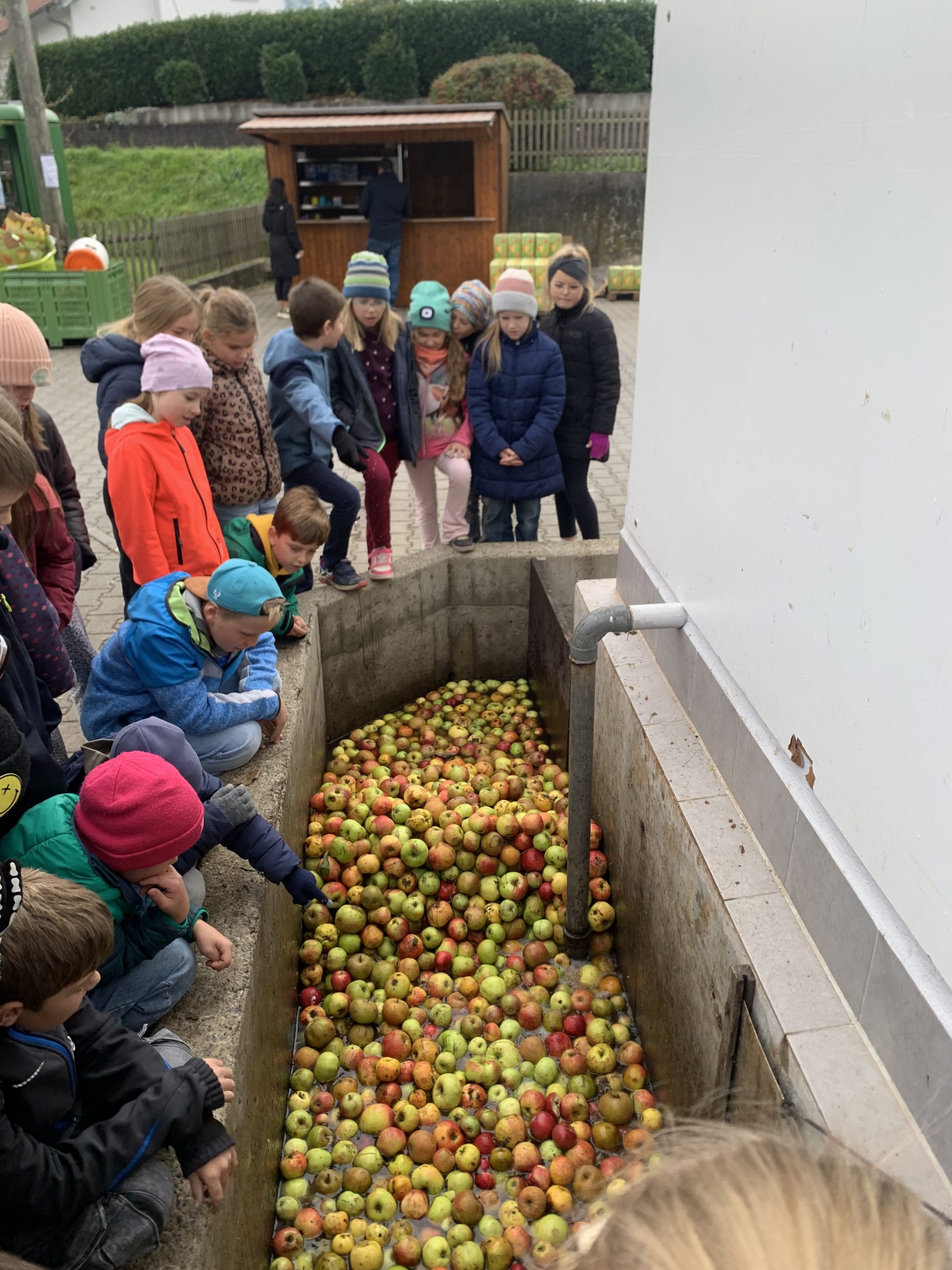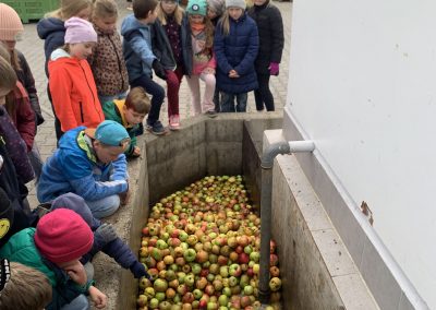 Am nächsten Tag besuchten die Mosterei Buchele. Die Kinder bekamen gezeigt, wie aus den gesammelten Äpfeln leckerer Apfelsaft gemacht wird. Klassenweise wurden sie durch die Mosterei geführt und bekamen alles ganz genau erklärt. Zum Abschluss gab es frischen, leckeren Apfelsaft zum Probieren.